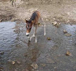 Lucky for the foal the creek is down making the crossing easy.